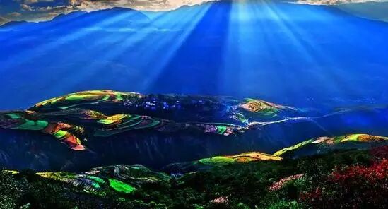 放眼望去,山川和原野呈现出一片片暗红、紫红、砖红等不同的红色,方圆数百里大大小小的山头、山坡上,油菜花与洋芋花热烈地绽放着,金色的麦浪在清凉的山风下如碧浪般翻滚,五彩斑斓,绚烂之极。