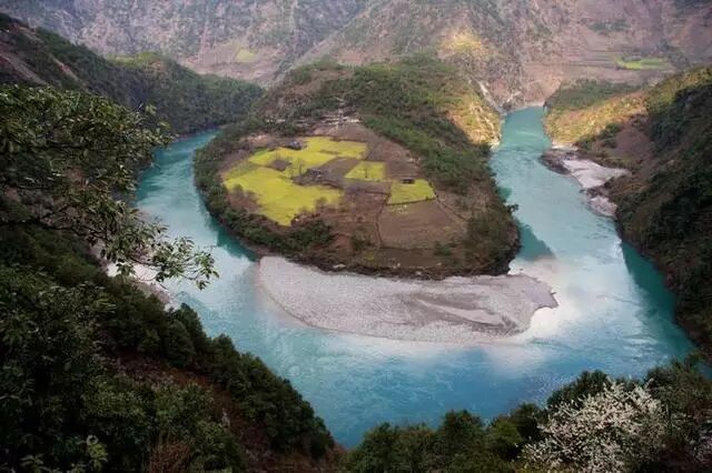 怒江大峡谷最北端,位于贡山县的丙中洛,是峡谷最美丽的地方。这里“雪山环抱,江河为池”,江水从北部的秋那桶深谷进入丙中洛,从丙中洛南边一直到大拉,形成弯弯曲曲几道弯,最大的一道弯在坎桶被称为“怒江第一湾”。