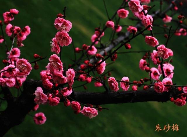 种植朱砂梅,如姬千鸟、红千鸟、多萼朱砂、粉红朱砂、绯司、墨梅、铁骨红、照水朱砂等,就像片片朝霞,使残冬生出盎然春意。