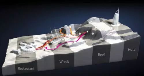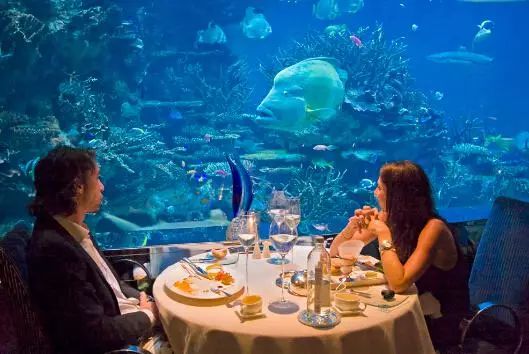客人如果想在海鲜餐厅中就餐的话,他们将被潜!水!艇!送到餐厅,这样他们就餐前可以欣赏到海底奇观。