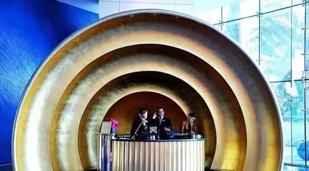 但这是黄金打造的前台啊,桌子虽小,背景却大。这么霸气的前台背景,完胜!