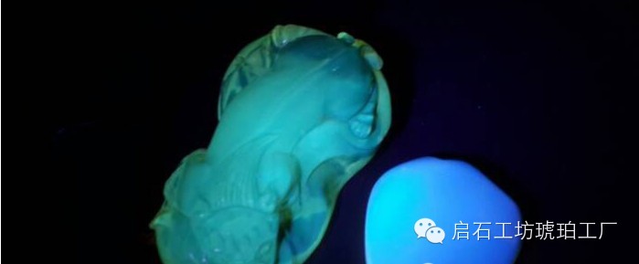 左边是波罗的海琥珀的荧光,右边是缅甸琥珀蓝白色荧光