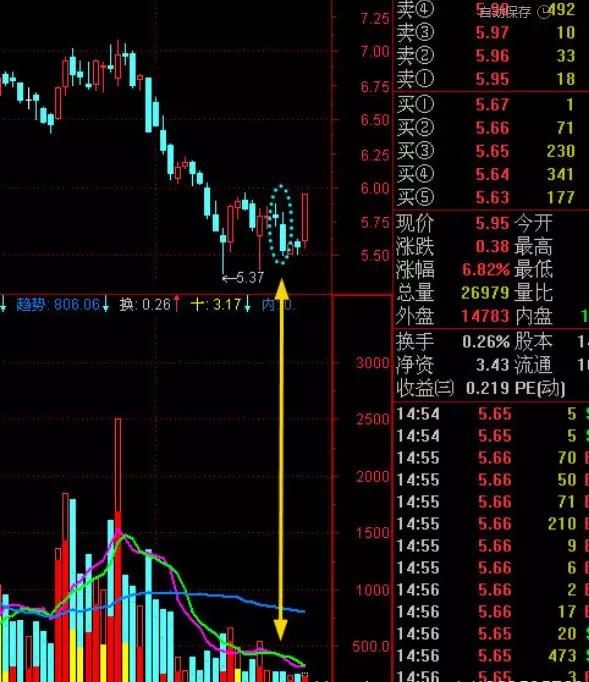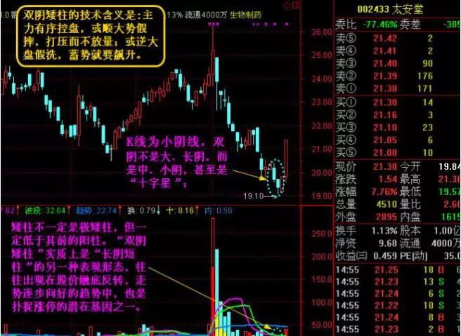 ————表述K线和量柱形态的专用词。“双阴矮柱”顾名思义是指K线为小阴线,量柱为矮绿柱,一般是双日或三日。其基本特征是:双阴不是大、长阴,而是中、小阴,甚至是“十字星”;矮柱不一定是极矮柱,但一定低于其前的阳柱。其技术含义是:主力有序控盘,或顺大势假摔,打压而不放量;或逆大盘假洗,蓄势就要飙升。使用“前推法”就近比较,“双阴矮柱”前的K线都是中、小阳,其后主力往往拉出中、大阳, K线组合多构成“N”字形态。操作上,可根据第三日的走势,积极稳妥介入。“双阴矮柱”实质上是“长阴短柱”的另一种表现形态,往往出现在股价触底反转,走势逐步向好的趋势中,也是扑捉涨停的潜在基因之一。