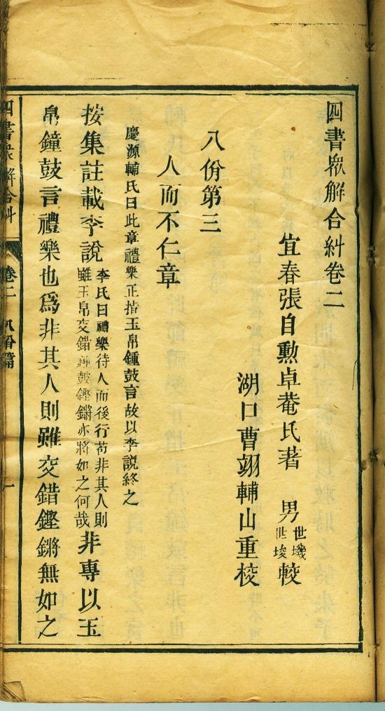 张自勋不是三家村的无名之辈,此书也非场屋之书。《四库总目提要》著录张自勋的著作三种:《纲目续麟》入史部编年类;《廿一史独断》入史部史评类存目;《卓庵心书》入子部儒家类存目。未著录此书。《纲目续麟》有四库全书本,《卓庵心书》有豫章丛书本,《廿一史独断》不知乾隆后是否有传本。《四书众解合纠》,大概只有这部道光十三年的排印本。而且流传不广,几大图书馆都未收藏,各家目录也未著录。或是家族排印,不出乡里。
