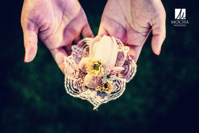 新娘是四川人,十分喜爱麻辣火锅。所以这次的手捧花材料选用辣椒,红与绿的相互呼应,再用银叶菊加以点缀,让整个手捧花更生动有趣,又有红红火火的吉祥之意。