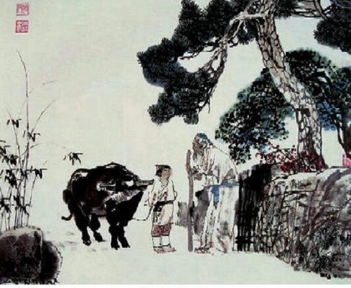 老叟惦念着放牧的孙儿,柱杖等候在自家的柴扉。