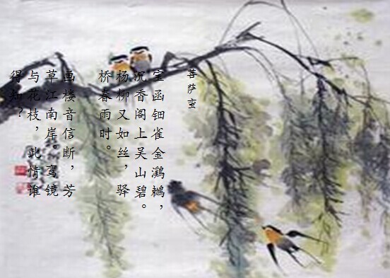 触景生情,视线难收,于是再放眼一望——“杨柳又如丝”,一个“又”字,透露了她内心的跃动,那时光的推移,年华的流逝,往事的回忆,都隐藏在这一“又”字之中,不仅如此,还使得下一句“驿桥春雨时”,这个本非眼前之景,也能勾粘得紧密无间。笔触纤巧自如,轻灵流走,意不浅露,词中虚字的妙用,于此可见。这两句写柳丝拨动女子的心弦,使她回到当年一个春雨潇潇的时刻,和情人在驿桥边,依依惜别的情景如在目前,而今杨柳又如丝,离人却在何处?它利用了时空的交替,前后的映衬,创造出耐人寻味的意境,这是温词凝练、深密的典型笔法。