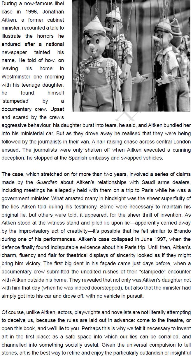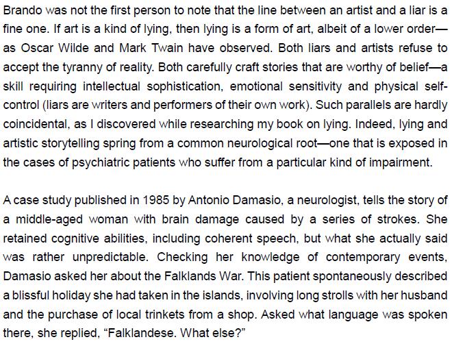 心理类:主要通过马龙白兰度的例子讲诉表演者都是很好的谎言家。