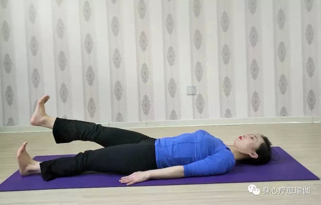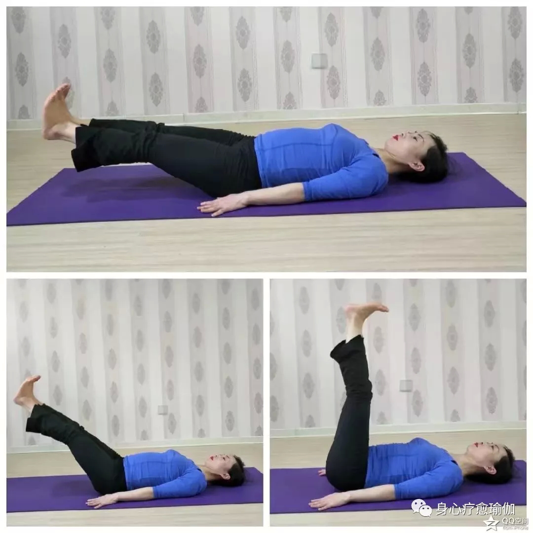 4、随吸气 ,右腿向上抬起到90度角保持,同样保持3个呼吸,呼吸方法同上,3个呼吸后放松右腿,调息。