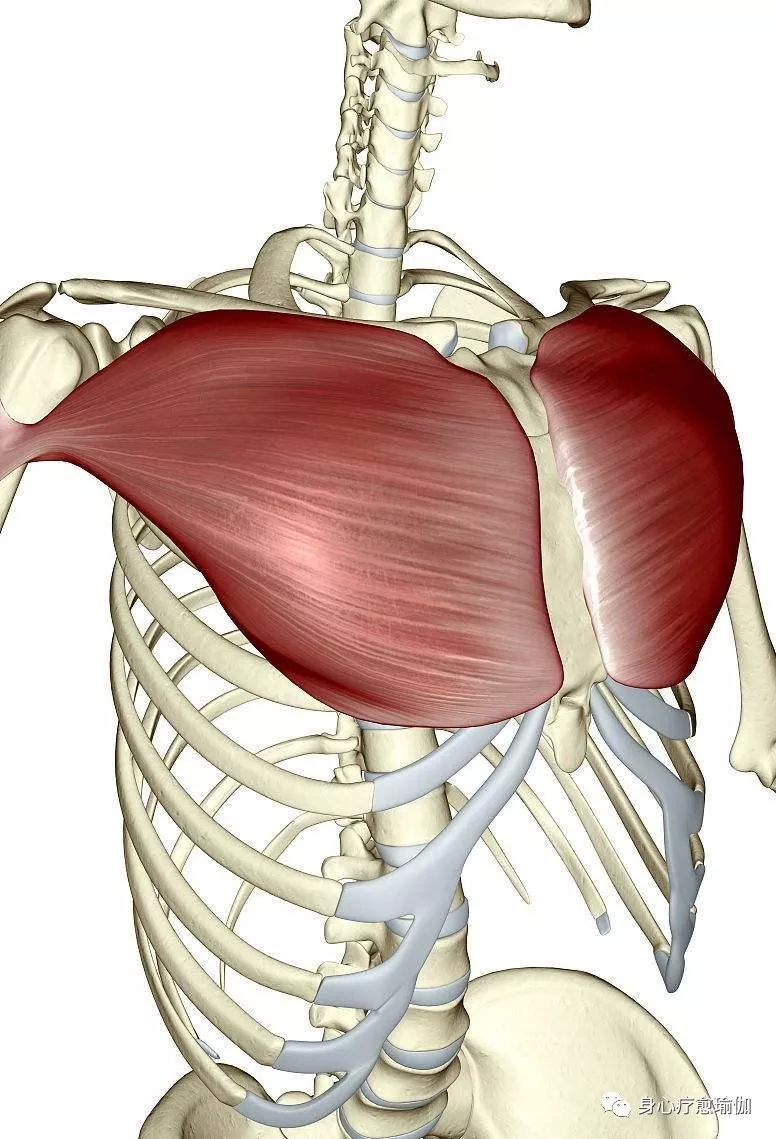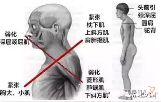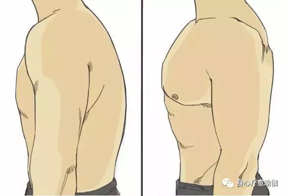 如果肩胛骨距离脊柱的距离相对过大,就是肩胛前突了;肱骨内旋带动整个上肢的内旋。出现“含胸驼背颈前伸”。