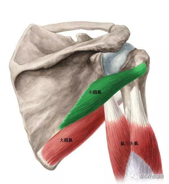 大圆肌:位于小圆肌的下侧,其下缘为背阔肌上缘遮盖,整个肌肉呈柱状,起于肩胛骨下角背面,肌束向外上方集中,止于肱骨小结嵴。