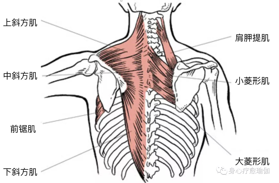 斜方肌:起于枕外隆凸、上项线、项韧带、第7颈椎及全部胸椎棘突。纤维分上、中、下三部分,分别止于锁骨外侧1/3、肩胛冈和肩峰。