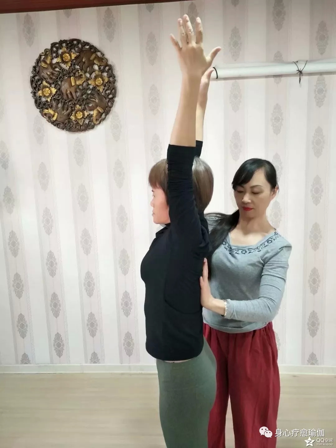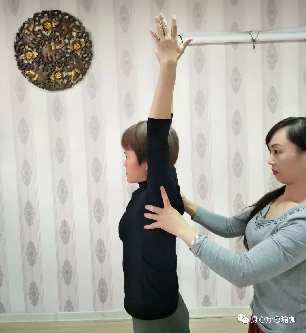 如果练习者比较胖,或者力量比较大,指导员要结合练习者的身体力量做出相对的回应力度,可能会费点力量,并引导练习者通过呼吸一步步展开大臂和胸部。