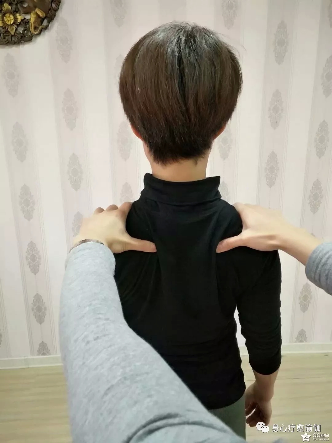 如图:两个大拇指压住两侧肩胛骨向中间挤压,其余四指按压双肩向下。
