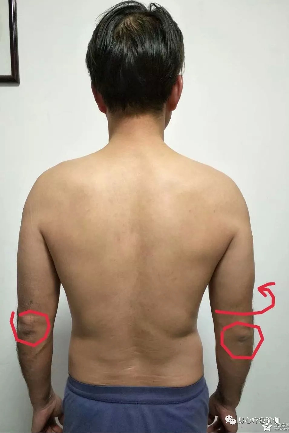 观察图片中的个案:两肘的鹰嘴突朝向外侧;且从后面能看到双手大拇指侧贴近双腿。如此显示个案大臂内旋。