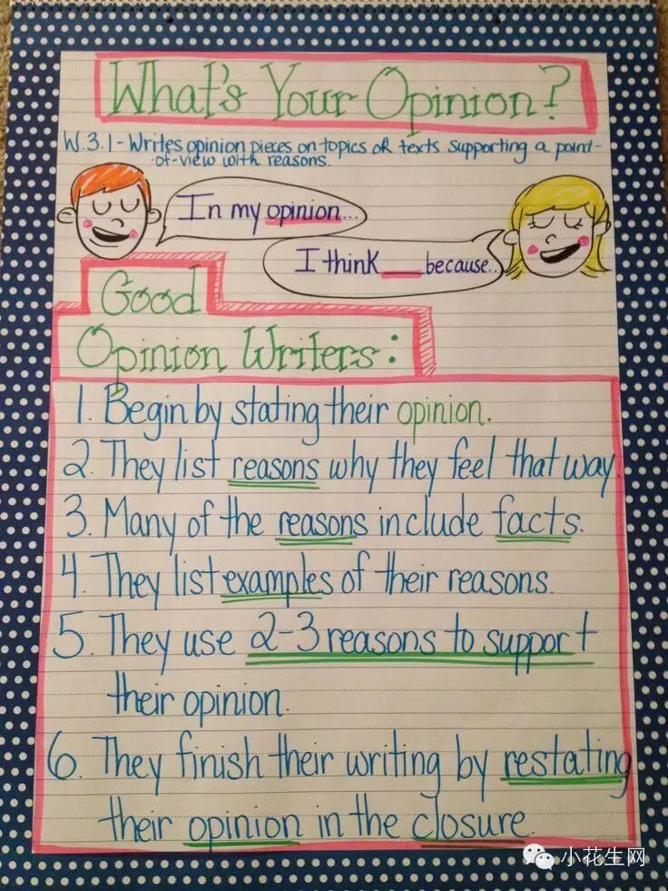 这张要点图,引导孩子表达自己的意见,把要点列出来了。虽然也主要是文字,但是这样条目化、视觉化后,孩子们很容易记住要点:先亮明观点,再列举原因(起码要2-3条),要有事实支撑,要有例子,要在结尾把观点再写出来。说实话,写大多数文章,不就是这么一回事么?