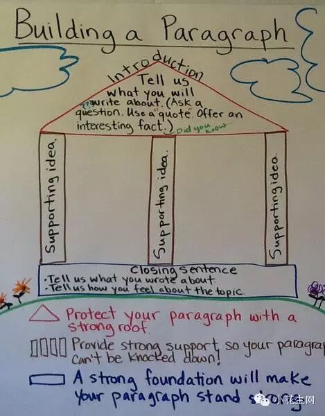 你看,老师用一个盖房子主题的要点图来说明怎样写一段文章。屋顶是主题或论点,三根屋梁是主要论据,屋基是结论。一栋好房子需要强壮的屋顶、屋梁和屋基,一篇好文章也是一样,论点、论据、结论都要很强。