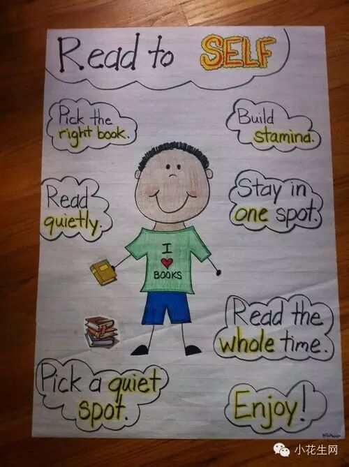 很多家长觉得孩子自己读书的时候很难静下来,不如和他一起画这样的一张 Anchor Chart -自己读书意味着:选对书、找个安静的地方、不要挪动、不要打断、低声朗读、要有毅力、享受阅读内容!