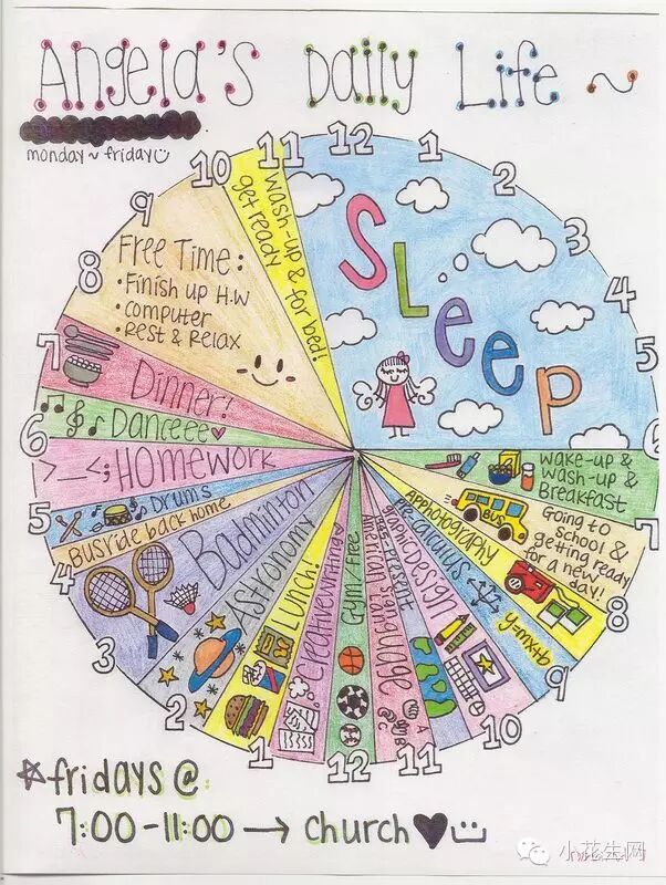 很多家长都抱怨孩子不懂得珍惜时间,做事磨蹭。下面这张Anchor Chart,很好看,把女孩Angela的一天24小时非常形象地展示出来。也可以给孩子做一张,这么一看,孩子就知道每天的时间是有限的,如果要做自己想做的事情,就得珍惜时间。