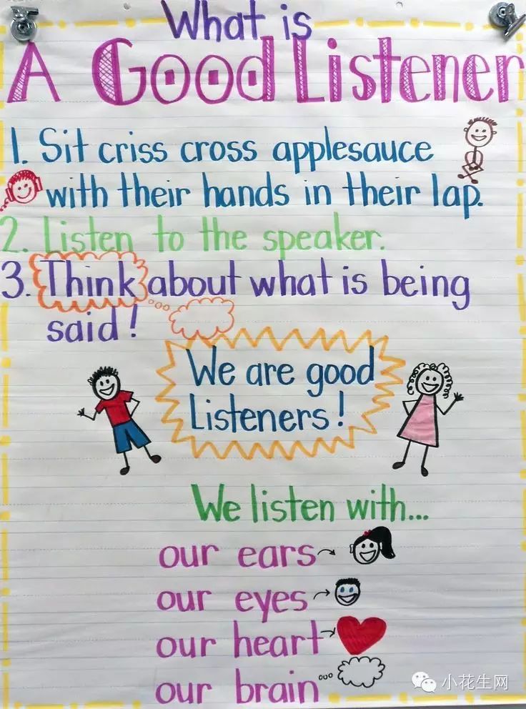比如,这是一个老师在教刚入学的孩子怎样好好上课,学会听讲?她和孩子们一起做了一个Anchor Chart。图里说:一个好的倾听者,会坐好,把手放在推上,仔细听人说话,思考别人说的内容。我们用耳朵听、眼睛听、心灵听、头脑听 ... 这样的东东,挂在教室里,是不是会很管用?