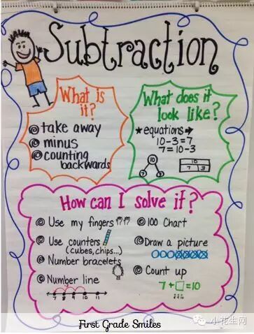 学数学、科学这些相对比较抽象的知识,尤其需要借助Anchor Chart帮孩子理解概念。刚开始学数学的小朋友光学一个减法,能这样用要点图总结一下,也会学明白很多呢!减法是怎么回事?看上去是怎样的?怎么做减法?