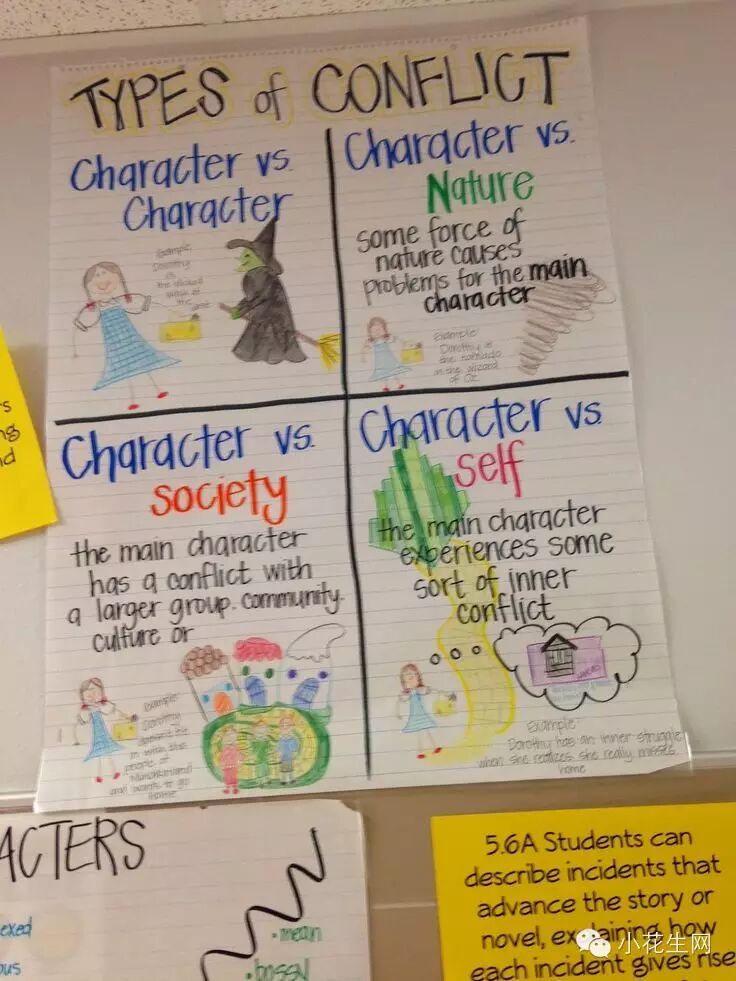 比如,教孩子去分析故事中的矛盾,会通过这张图引导孩子们从四个方面考虑:人物之间的矛盾、人物和环境的矛盾、人物和社会的矛盾、人物和自己的矛盾。这样一来,这场分析对孩子们来说就变得不再抽象,很容易下手了。