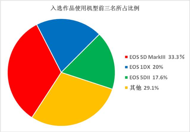 在50位入选作者中,使用EOS 5D MarkIII的高达17位,说明高性价比全画幅机型仍然是玩家的最爱。前代专业顶级机型EOS 1DX的使用数量排名第二,10位作者占比达20%,可见专业摄影师和高端摄影爱好者在比赛中占据强势地位。入选作者中,也不乏使用EOS 5D、EOS 50D甚至EOS 20D的“老炮”,可见佳能EOS单反确实“扛造”,用了十几年仍然能为摄影高手赢得回报。