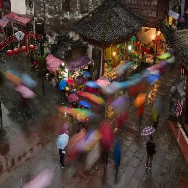 点评:一角即现古城韵味,低速快门让雨中行人的雨伞画出片片色彩,傍晚点亮的灯光和阴沉的天气让色彩变得更加浓郁,展现出古城老街的热闹景象。但受到拍摄角度和镜头的影响,画面有些头重脚轻。
