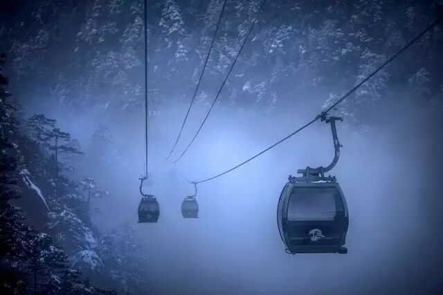 点评:雪后登峰,拍摄时机绝佳,渐渐湮没在云雾中的缆车,与山间的松树遥相呼应,似将驶入一个童话仙境。灰白画面的层次感也因大小虚实的缆车变得辽远。