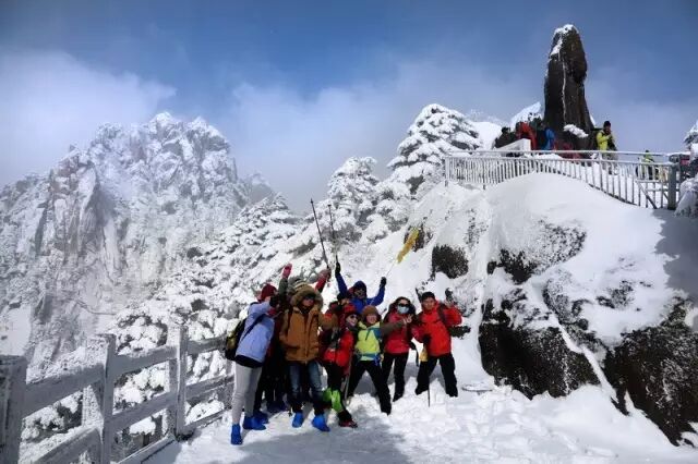 点评:雪中登峰,云开雾散,唯有一张合影可抒发喜悦心情。画面构图得当,将近、中、远的山顶景色全部囊括。