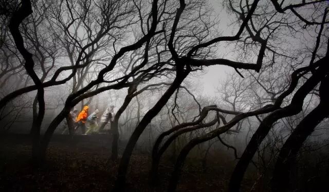 点评:冬季的黄山脚下阴雨绵绵,雾气中树木也在冬日中失去生机。作者以枯枝树木为前景抓拍缝隙中前行的游人,取两者方向的近似,形成统一的动感。但枯枝的视觉感受过于强大,减弱了游人冒雨前行的力量感。