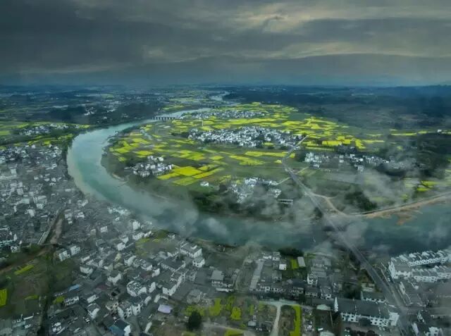 点评:白墙灰瓦,黄绿田间,在河岸两旁延展开来。航拍角度和拍摄季节恰好,但昏暗的天空和后期处理的灰冷色调让画面少了春天生机勃发的气息。