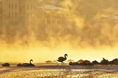 在迷雾缭绕的清晨,天鹅在布拉格的伏尔塔瓦河上跳舞。