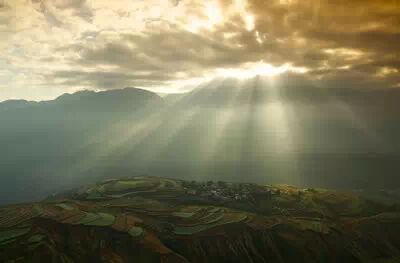 在这个角度可以看到太阳光芒照射下的真个梯田。