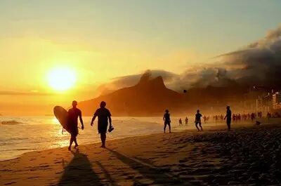 日落时分的伊帕内玛海滩,夕阳洒在金色的沙滩上。