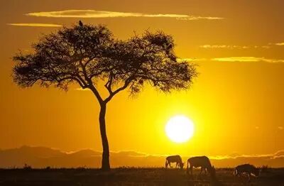 日出时分的马赛马拉国家保护区,阳光照着高大的金合欢树和低头吃草的牛羚。
