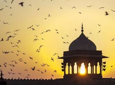 清晨的贾玛清真寺,这个圆顶的小亭子赋予了初升的太阳一个完美的轮廓。