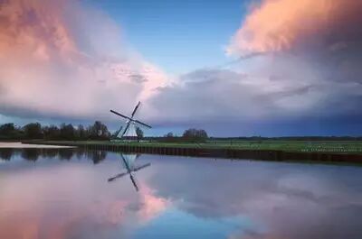 暴风雨后荷兰农田的日落景观。