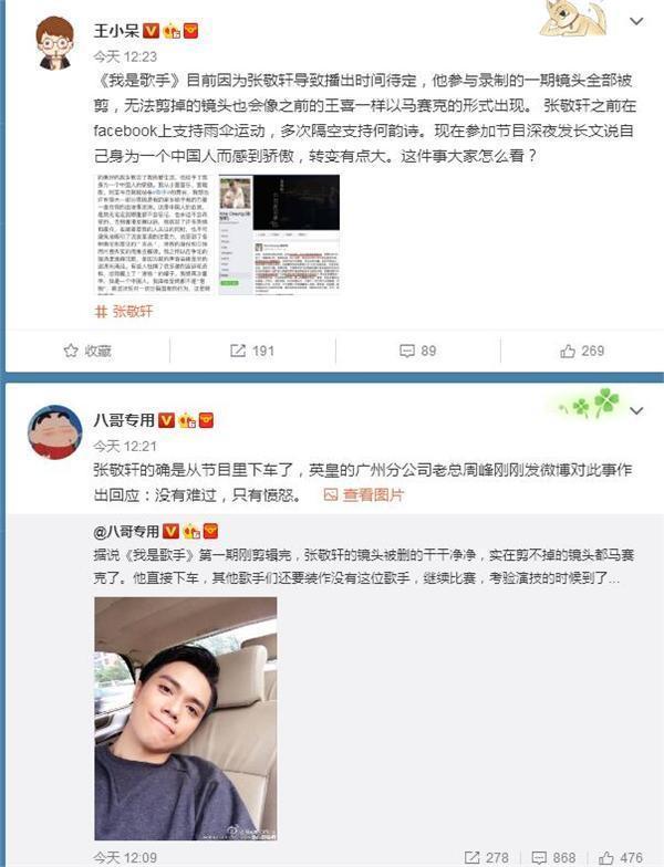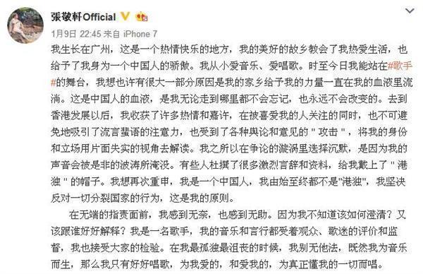 虽然之前张敬轩发微博承认自己是中国人,反对一切分裂祖国的行为,虽然挽回了一部分人气。但最终还是得为自己曾经说过的话负责。