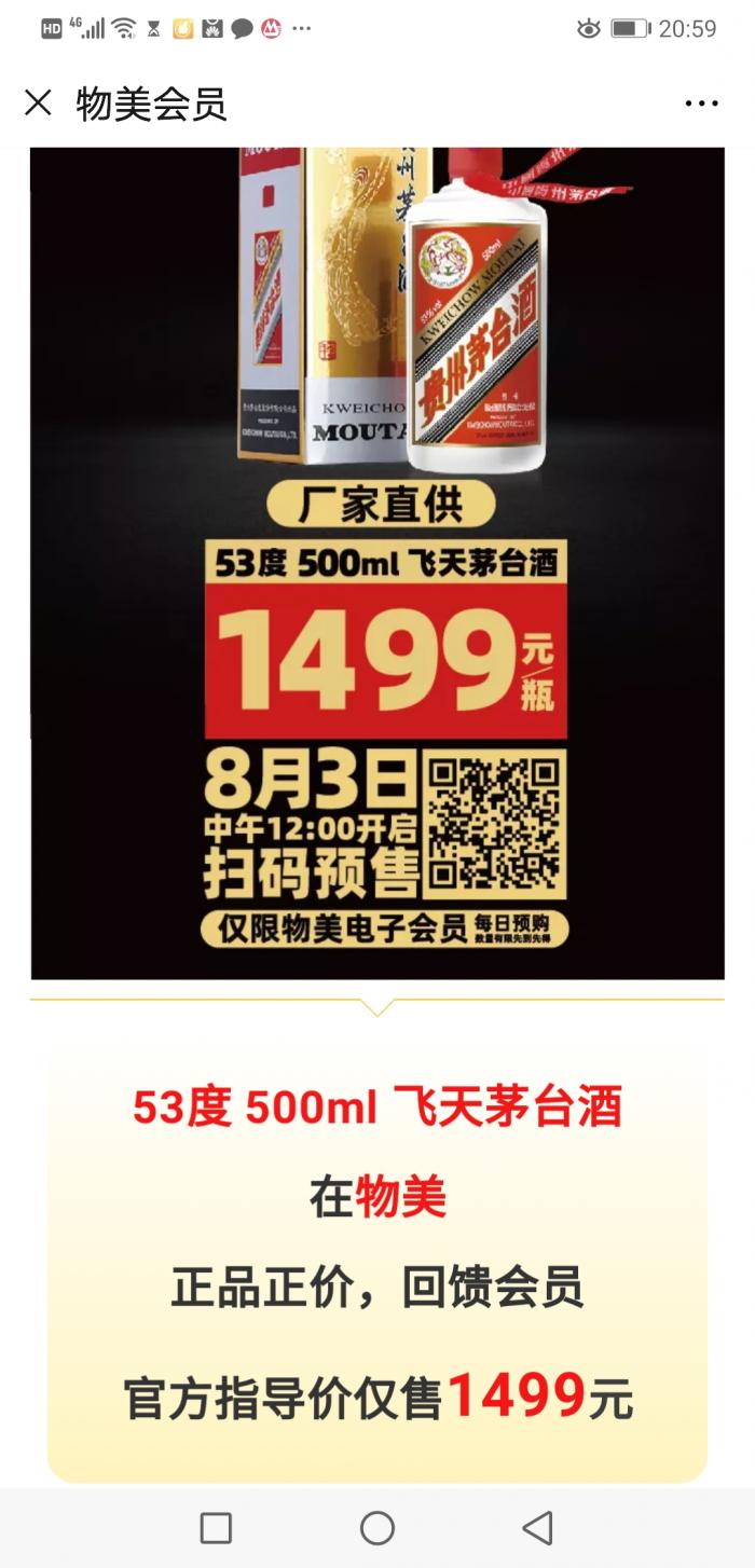 该集团8月2日再次宣布,其于7月成为贵州茅台酒首批全国商超卖场服务商。物美电子会员从8月3日中午12点开启扫码预售,53度500毫升的飞天茅台酒在物美的官方指导价是1499元!