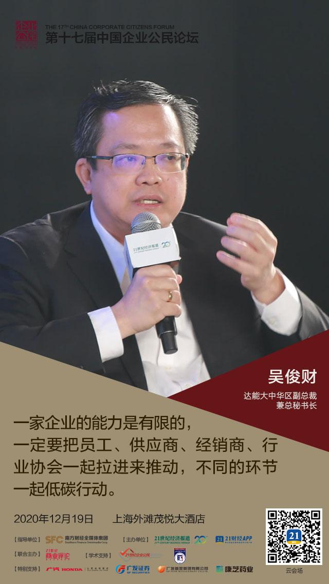 “因为执行低碳是一个非常庞大的工程。一家企业的能力是有限的,一定要把员工、供应商、经销商、行业协会一起拉进来去推动,这同的环节一起做低碳行动,然后量化、内部审计、请外部权威机构评估。”吴俊财在中国企业公民论坛上介绍经验。