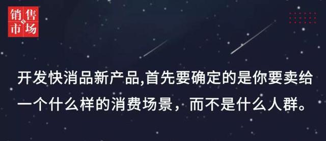 你在开发一个快消品新产品/新品牌时,出发点、第一要确定的就是他的消费场景是什么,你要卖给一个什么样的消费场景,而不是什么人群。确切地说,是你要首先找到一个场景营销的市场机会,然后根据这个场景机会去开发新产品。其次是你锁定的场景及解决方案目前在人们的心智中还没有一呼而出的品牌占位,也就是还是空白的机会。当然,这个场景必须是客观存在的、实效的。