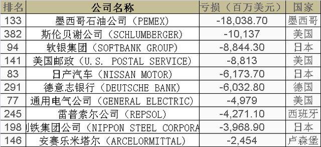 另外,今年共有45家公司未能实现盈利。在亏损公司子榜上,墨西哥石油公司亏损约180.38亿美元,成为亏损最多公司。