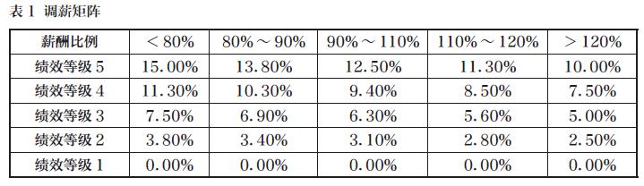 表1是企业在调薪时经常使用的调薪矩阵,横行是员工的薪资高低,以薪酬比率来表示;竖列是员工的绩效结果。这样,每个员工根据自己的薪酬比率和绩效结果就会对应一个相应的调薪幅度。
