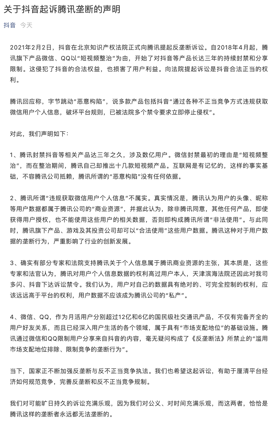 2月2日晚间,针对腾讯认为字节跳动“恶意构陷”的回应,抖音再次发布声明。