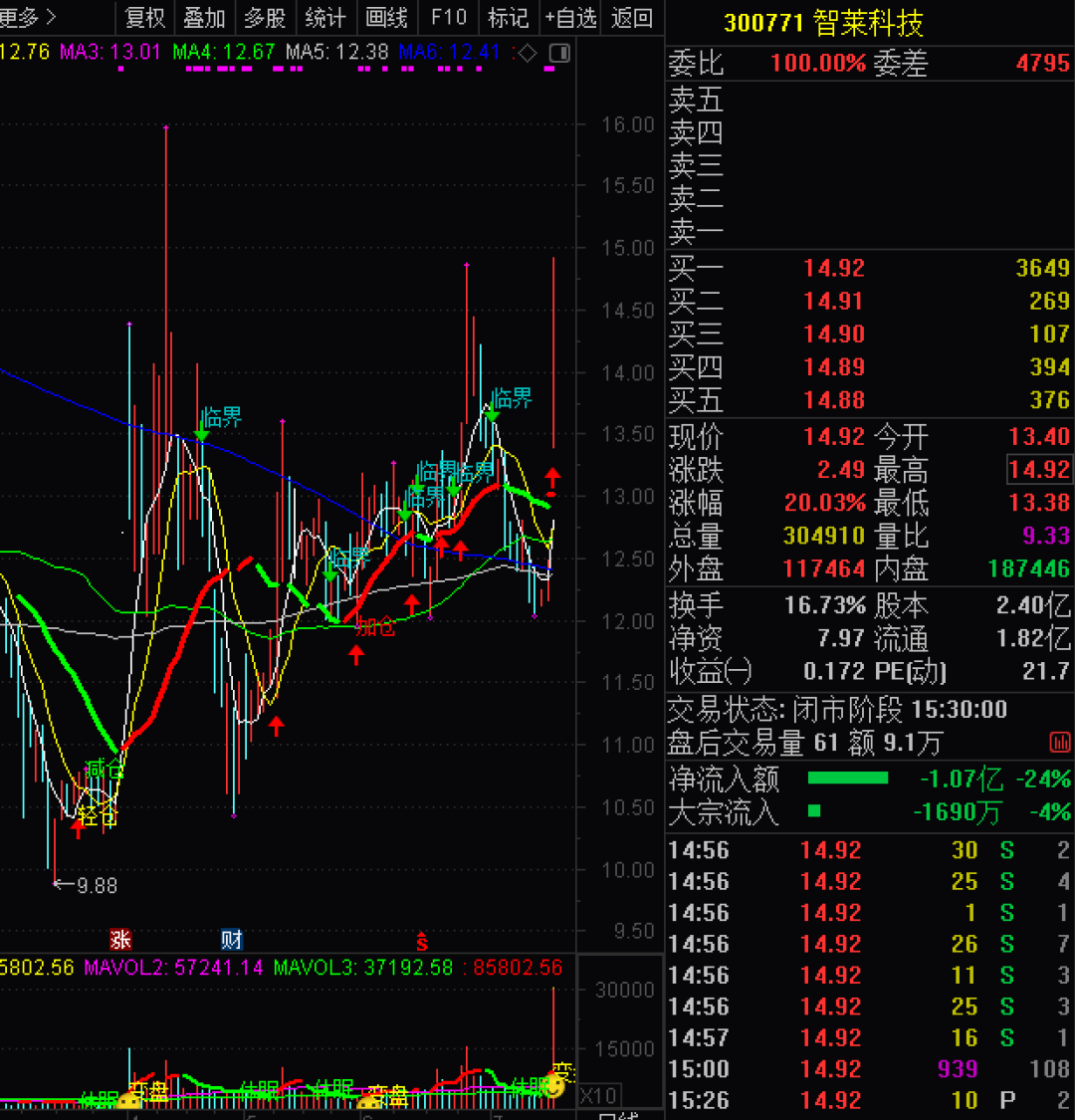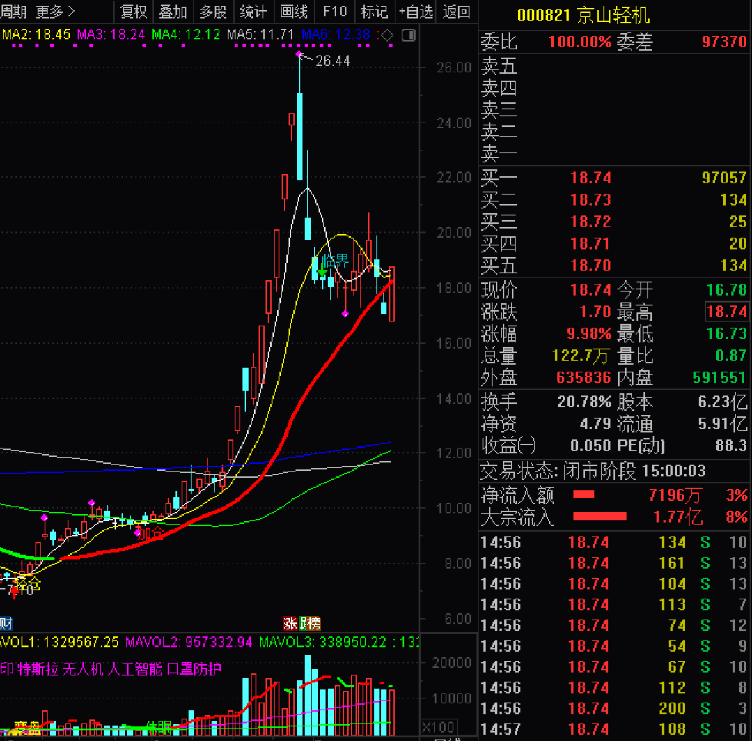 京山轻机,老情人了,上一波几乎翻倍的完美把握,及时规避了快速回调,今日再次强势封死涨停板!跌破牛熊线后快速涨停板回防,且无明显放量,非常有可能会再次启动新行情,下周密切关注九龙决策系统分时形态,只可意会不可言传。