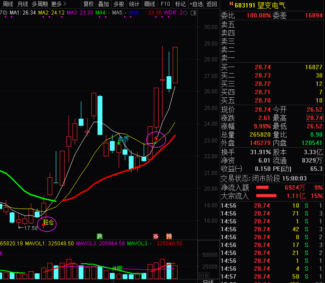 望变电气,跨度有点大的多方炮次新股,双买点出击+牛熊线翻红+红箭头。主要产品为输配电及控制设备和取向硅钢两大类。有望延续上攻走势。