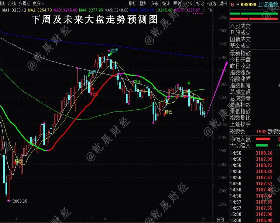 以目前大盘所处的形态位置分析,指数已经打到了3173点支撑位,时间、空间、形态都基本到位,若单纯从技术上分析,下周大盘有望直接进入反攻阶段,已经没有时间和空间再墨迹了!若不是赶上周五,资金面谨慎,今日可能就是金针探底或中阳线。目标位依然是3424.84点之上,这个恶心的点位必须拿下,否则就对不起这一波阵亡的将士们!本周的走势就是洗不坚定的筹码,逼最后一个多头翻空!若周一开盘前有突发利空,大盘继续破位,尤其是跌破前低,则市场短线就比较麻烦,10月底之前几乎很难有大级别反弹行情出现,就只能等年底前最后一波行情了,要有持久战的心理准备,不过这种几率目前看依然比较低。我个人对下周看的依然是比较乐观的,除非有重大突发利空刺激(个人观点,仅供参考,据此操作,风险自负)。