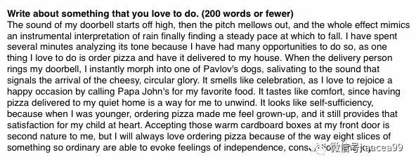 今年3月份,卡罗莱娜·威廉姆斯收到了来自耶鲁大学的录取通知书。不仅仅是因为她年级前十的优秀成绩和多项课外活动,更因为她那篇关于对订披萨外卖的喜爱的文书在中众多申请文书中一下子就抓住了考官的眼球。她说道“当我看到申请文书题目是写一篇关于我喜欢做的事的时候,我脑海里第一个蹦出来的想法就是订披萨外卖!因为我真的太喜欢订披萨外卖的那种幸福感了!”在这篇短短的200字的文书中,她是这样描述她对订披萨的喜爱的“订披萨外卖对于小时候的我来说有种长大了的幸福感。对于现在的我来说,从听到门铃声到接过温暖的披萨盒已经成为一种自然的习惯。当门铃响起的时候,我都会迫不及待冲到门口去,那种浓郁醇厚的芝士味真的太幸福了。被切成8块的披萨虽然看似普通,可是它带给我的独立,温暖和快乐确实无以伦比的。”