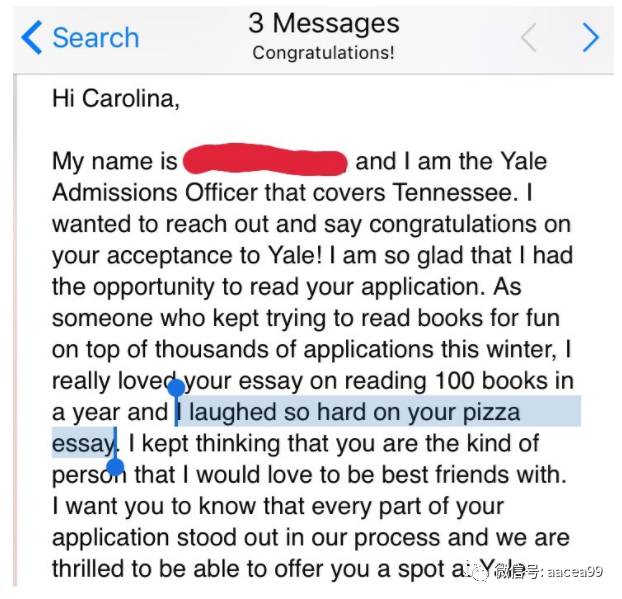 耶鲁的招生官在给卡罗莱娜·威廉姆斯的回信中写道,看完你的文书,我忍不住的大笑了起来,因为我也是和你一样喜欢披萨。而且我不禁觉得你一定是个很有趣的人,至少让我想要和你做朋友。”